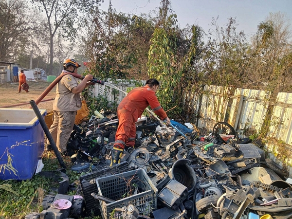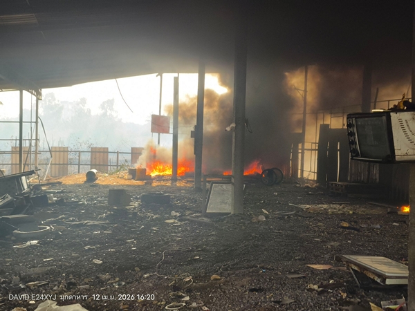 เปลวไฟโหมลุกไหม้อย่างรุนแรง พร้อมกลุ่มควันสีดำพวยพุ่งปกคลุมทั่วบริเวณ ขณะที่ชาวบ้านต่างพากันช่วยขนย้ายสิ่งของและเฝ้าระวังไม่ให้เพลิงลุกลามเข้าบ้านเรือน