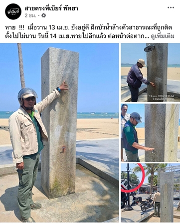 โดย ล่าสุดจากการตรวจสอบภาพกล้องวงจรปิด พบว่า เมื่อวันที่ 13 เม.ย.69 ฝักบัวชายหาดที่เมืองพัทยา เอาไว้ให้นักท่องเที่ยวอาบน้ำได้หายไปอีกทั้งที่เมื่อไม่นานมานี้ได้มาดำเนินการแก้ไขให้สามารถใช้ได้เป็นปกติแล้ว