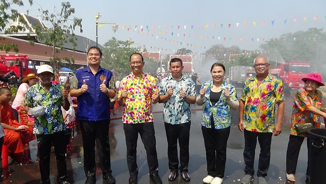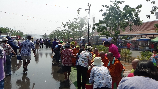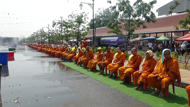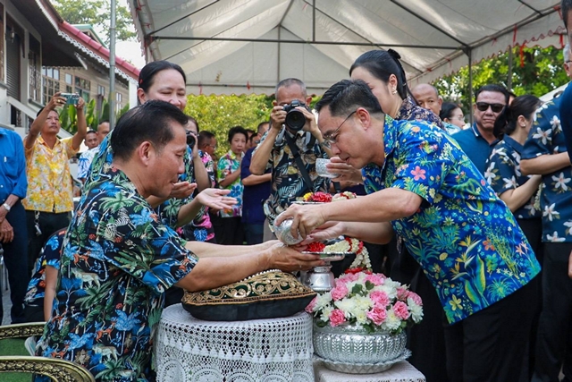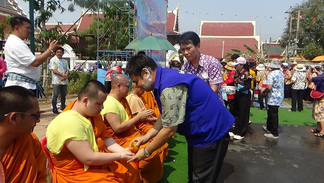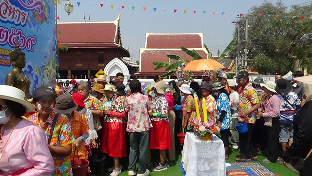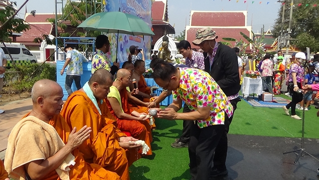 จากนั้นเวลา 14.00 น. นายทัศนัย สุทธาพจน์ รองผู้ว่าราชการจังหวัดอ่างทอง เป็นประธานสรงน้ำพระภิกษุสงฆ์ จำนวน 103 รูป ซึ่งประเพณีนี้มีความพิเศษที่เป็นเอกลักษณ์ของวัดไชโย โดยพุทธศาสนิกชนจะมาร่วมกันสรงน้ำพระภิกษุ ที่นั่งเรียงรายตามถนน