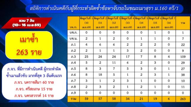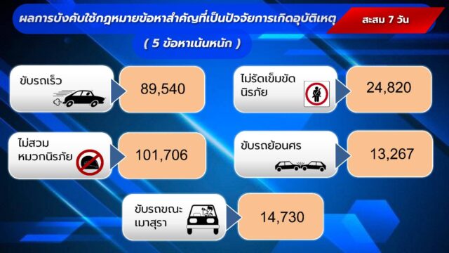 ในส่วนของการบังคับใช้กฎหมายจราจรช่วงควบคุมเข้มข้นทั่วประเทศ ระหว่างวันที่ 10 – 16 เมษายน 2569 พบผู้กระทำผิดใน 10 ข้อหาหลัก รวมทั้งสิ้น 435,387 ราย โดยใน 5 ข้อหาเน้นหนัก ได้แก่ ไม่สวมหมวกนิรภัย 101,706 ราย ขับรถเร็วเกินกฎหมายกำหนด 89,540 ราย ไม่คาดเข็มขัดนิรภัย 24,820 ราย ขับรถขณะเมาสุรา 14,730 ราย (กระทำผิดซ้ำ 263 ราย) และขับรถย้อนศร 13,267 ราย