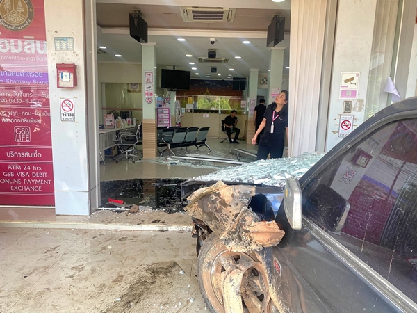 มุกดาหาร/นาทีระทึก! กระบะเสียหลักพุ่งทะลุธนาคารออมสินนิคมคำสร้อย กระจกแตกกระจายเกลื่อน บาดเจ็บ 3 ราย