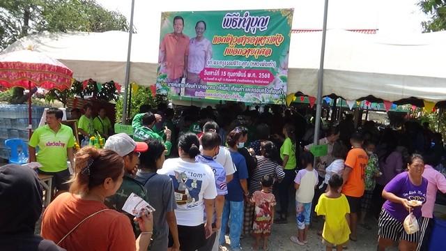 อ่างทอง ประชาชน 3 ตำบล รับแจกข้าวสารอาหารแห้ง 400 ชุด อุทิศให้หลวงพ่อเต่า เกจิดังลุ่มแม่น้…