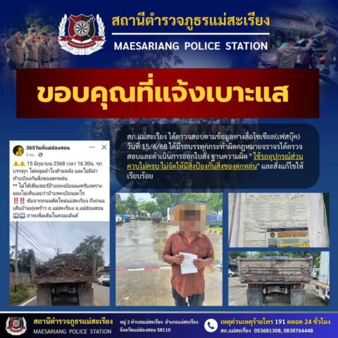 Read Moreแม่ฮ่องสอน-ขอบคุณที่แจ้งเบาะแส สภ.แม่สะเรียง ดำเนินการออกใบสั่งการกระทำผิดกฎหมายจราจร พร้อมให้แก้ไขการบรรทุก