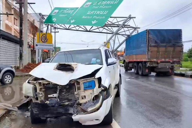 มุกดาหาร -กระบะเสียหลักชนเสาป้ายกลางถนนชยางกูร มุกดาหาร โชคดีไร้ผู้เสียชีวิต – ป้ายบอกทางพังเสียหาย