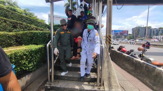 ปทุมธานี หนุ่มต่างชาติเครียดใช้กรรไกรทำร้ายตัวเอง หวังกระโดดสะพานลอย เจ้าหน้าที่ช่วยไว้ได้…