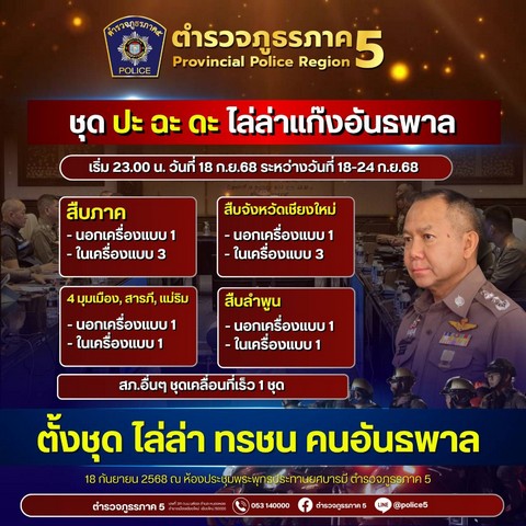 Read Moreเชียงใหม่-ผบช.ภ.5 เร่ง กวาดล้าง “ไล่ล่า ทรชน คนอันธพาล“