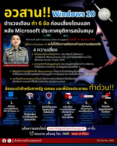 Read Moreสำนักงานตำรวจแห่งชาติ เตือน อวสาน Windows 10 เหลือเดือนสุดท้าย เสี่ยงโดนแฮก หลัง Microsoft ยุติการสนับสนุน 14 ตุลาคม 2568 นี้