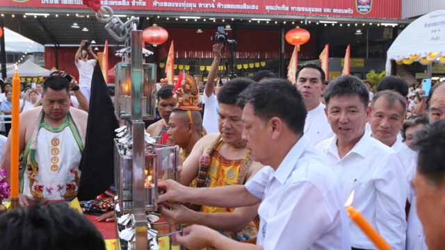 ชุมพร – พิธียกเสา ‘โกเต็ง’ อัญเชิญตะเกียง 9 ดวงขึ้นสู่ยอดเสา เทศกาลถือศีลกินเจ 68 ว…
