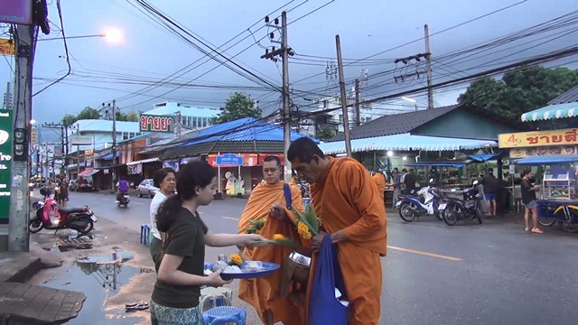 สงขลา-ประชาชนชาวสงขลาสวมเสื้อสีดำ-ขาวไว้ทุกข์ ออกมาทำบุญตักบาตรพระสงฆ์ท่ามกลางสายฝน ถวายเป…