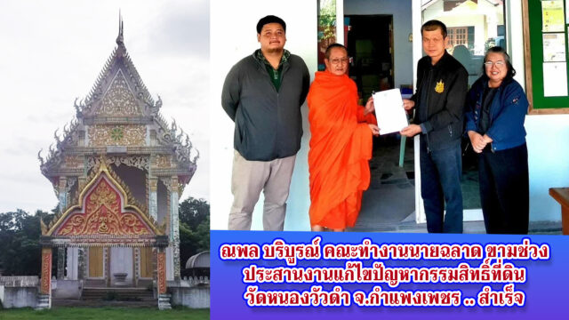 ณพล บริบูรณ์ คณะทำงานนายฉลาด ขามช่วง รองประธานสภาผู้แทนราษฎร คนที่สอง ประสานงานแก้ไขปัญหากรรมสิทธิ์ที่ตั้งอุโบสถวัดหนองวัวดำ จ.กำแพงเพชรสำเร็จ จนกรมป่าไม้อนุญาตให้ใช้พื้นที่